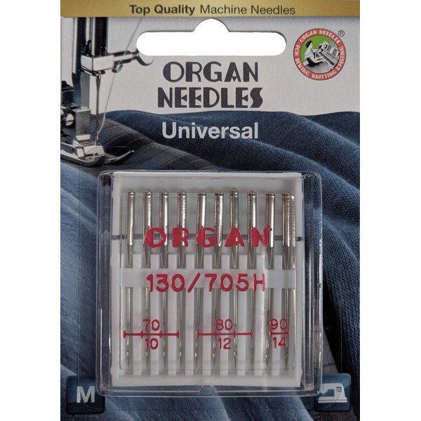 Universal needles have a normal round point and are designed for general sewing on a home sewing machine. Also known by the reference number 130/705H.