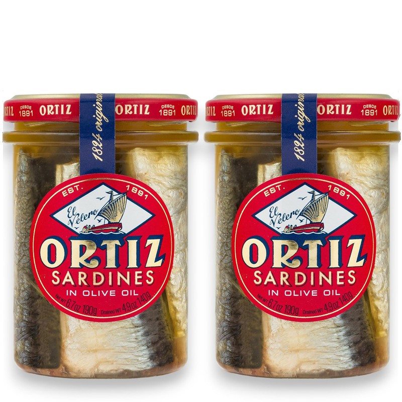 Ortiz Sardines A la Antiqua 'Old Style', Moist and Tender, Wild Caught in Spain and Hand-Packed in Premium Extra Virgin Olive Oil, Enjoy in Salads, Sandwiches and on Toast, 6.7oz Jar (Pack of 2)