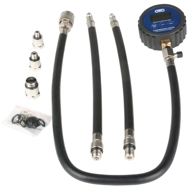 - OTC's Digital Compression Tester Kit features a 2-1/2 inch digital gauge that features a backlit LCD and rugged protective outer boot and comes complete with adapters and hard case