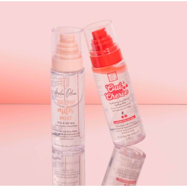 Oui Cherie Dual-Phase Mist & Glow Milk Seal & Set Mist - Ideal for dehydrated & dull skin, helps to hydrate the skin and prep it before applying makeup. The Beauty Crop X Amelia Olivia Glow Milk Set & Seal Mist Set and seal your makeup through the day & night with our weightless and alcohol free setting mist. The multitasking mist hydrates, sets, and seals your makeup by creating an advanced technology barrier to lock your makeup in place. The fine mist gives a subtle dewy finish that is ultra hydrating as it is formulated with skin loving Hyaluronic Acid, Panthenol and Glycerin. It is also enriched with anti-bacterial Rose Water, and pore-reducing Niacinamide making it suitable for oily and acne-prone skin. say goodbye to melting, creasing and cakey makeup. Say hello to glow, seal and set!  Oui Cherie  - 100ml Glow Milk - 100ml