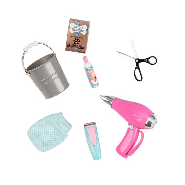 • Package includes 1 bucket, 1 box of dog treats, 1 shampoo bottle, 1 mittens, 1 scissors, 1 clipper, 1 non-working hair dryer with sound, dolls, pets and outfits sold separately.