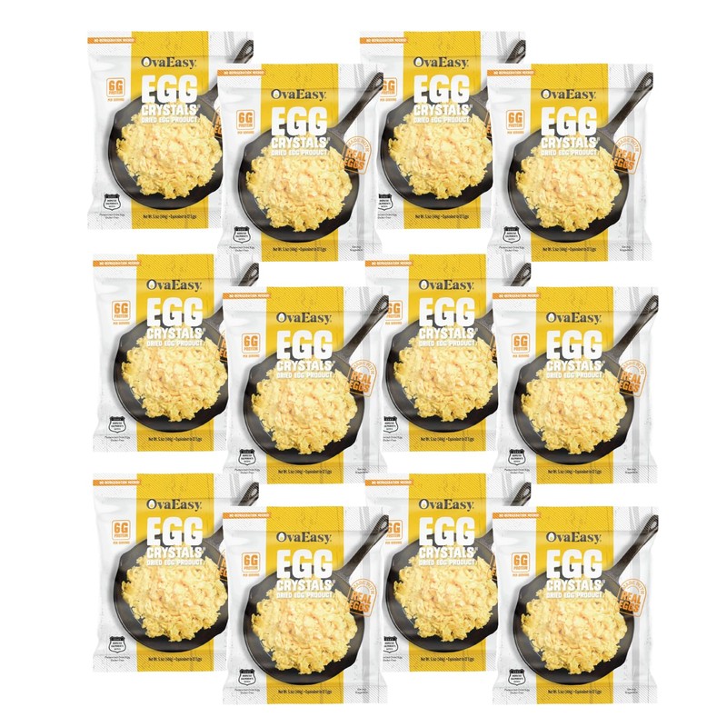 • SHELF-LIFE - Each pouch contains the equivalent of 12 eggs and OvaEasy Whole Egg crystals have a shelf life of 2.5 years with no refrigeration.