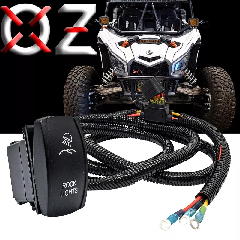 OZ-USA Plug and play power busbar distribution block wire with ROCK lights On/Off rocker switch compatible with Can-Am Maverick X3 Max RS Turbo RR, Sport, Trail, and Defender. 6' AWG #14 wire harness with pre-installed power distribution block terminal rings with On/Off rocker switch compatible with in-dash rocker switch panel. Built-in fuse holders for both the ignition wire and constant power wire. This accessory wire harness will make it easier to add the LED rock lights. Simply plug in the LED rock light wire to the back of the rocker switch. The rocker switch can handle up to 240 Watt LED lights.