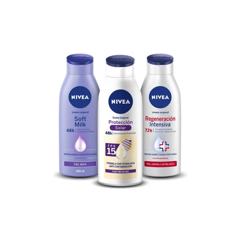 Hidrata, protege y cuida tu piel con este pack completo. Incluye Crema Corporal NIVEA (400ml), Protector Solar NIVEA UV 15 (400ml) y Leche Corporal Soft Milk (400ml). ¡Una rutina perfecta para una piel suave y protegida todo el día! 🌞💦✨ #CuidadoDeLaPiel #ProtecciónSolar #Hidratación