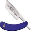 6 1/2" closed. 4 1/4" stainless razor blade with masonic logo etching. Dark Blue celluloid handles. Front handle has masonic logo artwork.
