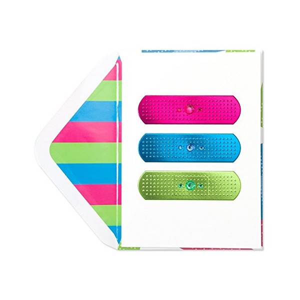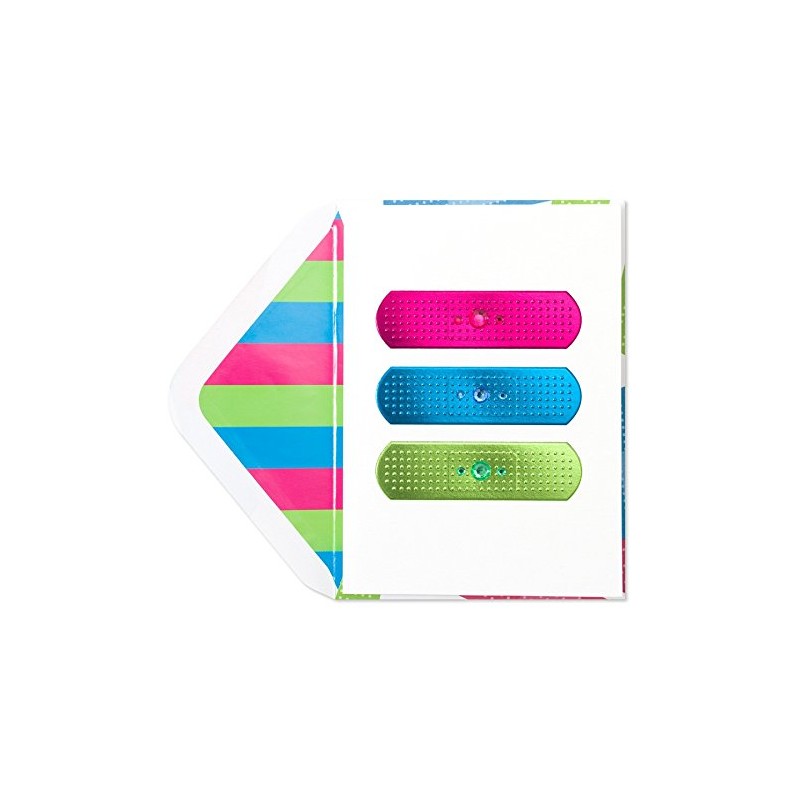 Cheer them up while they are feeling down with this bright, fun band-aid card. Colorful foil, gems, and a creative design makes this get well card delightful to receive. The card comes with a matching band-aid pattern envelope with a colorful stripe liner.