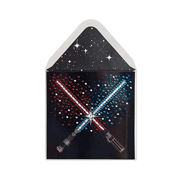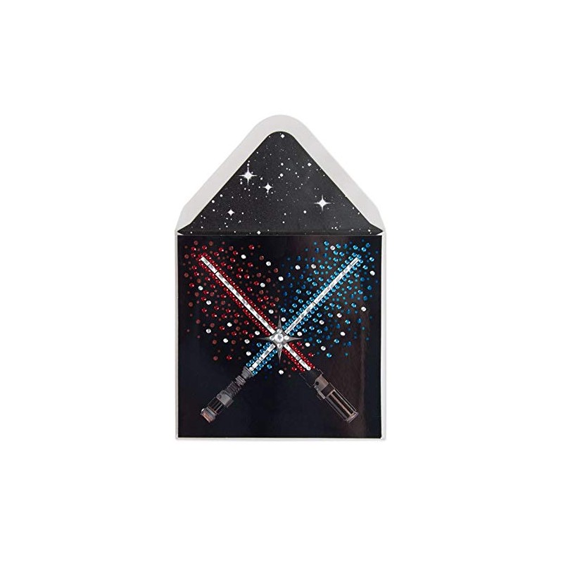 • Card features two lightsabers crossed over each other as gems explode around them.