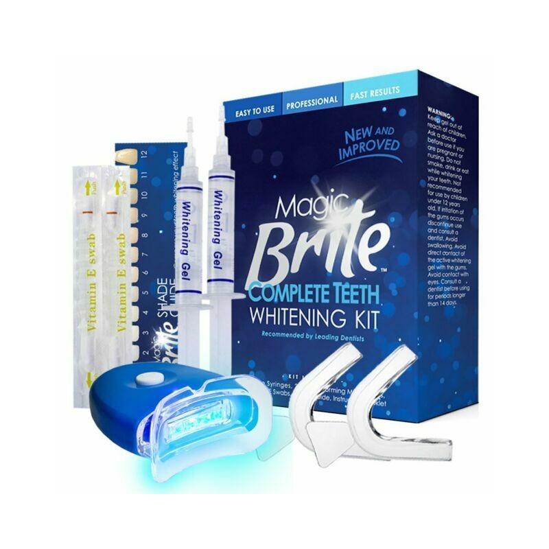 Includes whitening trays, led light, gel syringes. Guaranteed to whitening each tooth.