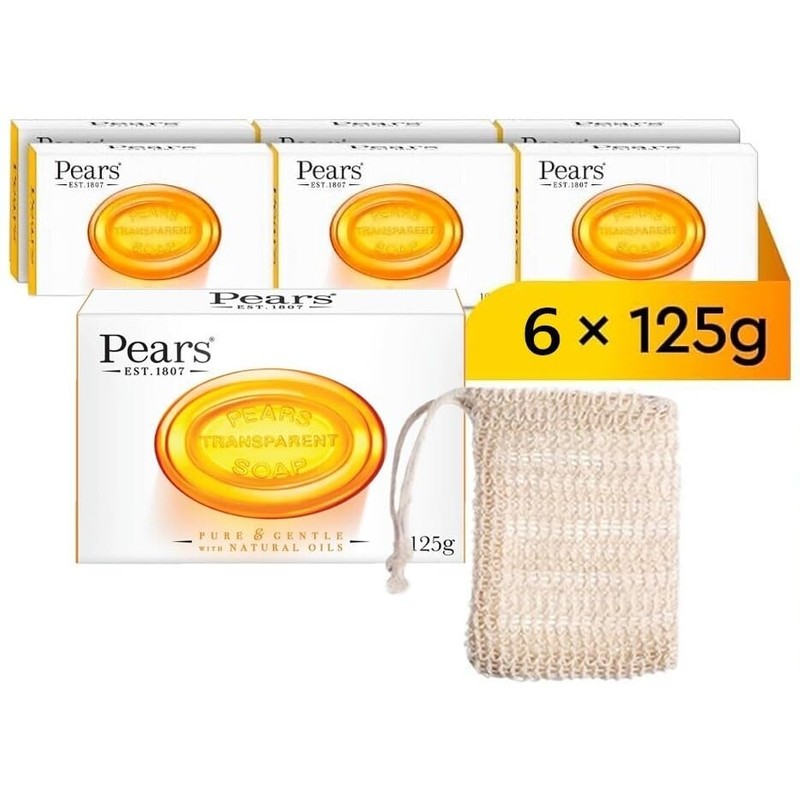 - Purchase a 6-pack of Pears Transparent Amber Soap (125g each) and receive a complimentary Pears Soap Bag for a complete skin cleansing experience.
