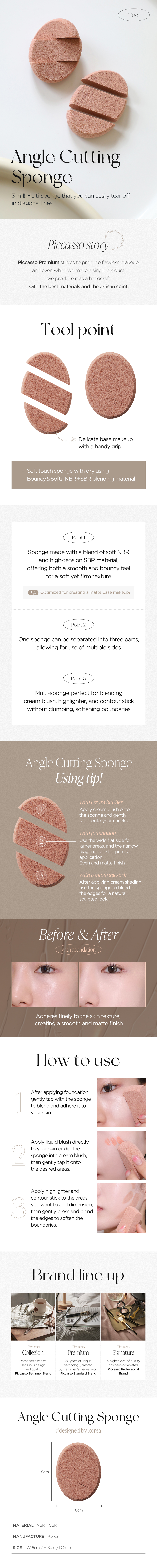 This is a 3 in 1 multi-sponge that is torn diagonally. PICCASSO Premium strives to create flawless makeup looks and puts in the utmost effort to craft each and every product with the finest materials and craftsmanship. This is a soft touch sponge that does not need to be soaked in water. This is a soft touch sponge that does not need to be squeezed in water. A multi-item that can be used in various ways by separating one sponge into three pieces. A versatile sponge that helps release the boundaries without clumps when using cream type blush, highlighter/shading sticks. Smooth and fluffy skin that adheres finely along the skin texture.