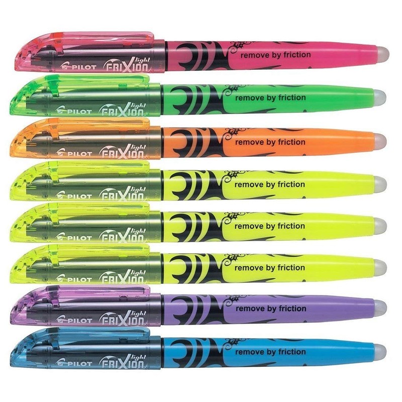 Textmarker Frixion light. Fehlerhafte Markierung einfach wegreiben und korrigieren! Radierer am Schaftende. Thermosensitive Tinte. Mit der Gummispitze am Schaftende kann durch Reibung (Wärme ab ca. 60°C) die Schrift weggerieben werden und bei Kälte (ab ca. -10°C) erscheint die Schrift wieder. Strichstärke 3,8 mm. Spitze schräg. Sofort markierbereit! Kein schütteln, kein anpumpen. Hohe, intensive Leuchtkraft. Gehäuse mit Tattoo Design. Clip und Kappe transparent und in Farbe. Gehäusefarbe = Markierfarbe. Nicht Dokumenten geeignet. Packung mit Inhalt: mit 8 Stück Frixion Light blau, grün, 3x gelb orange, violett und pink.