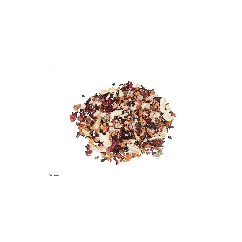 Ingredients: apple, hibiscus, rose hip, elderberries, pineapple pieces, grated coconut, coconut chips (coconut, coconut oil, sugar), flavouring.