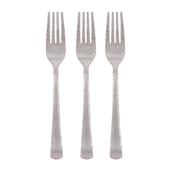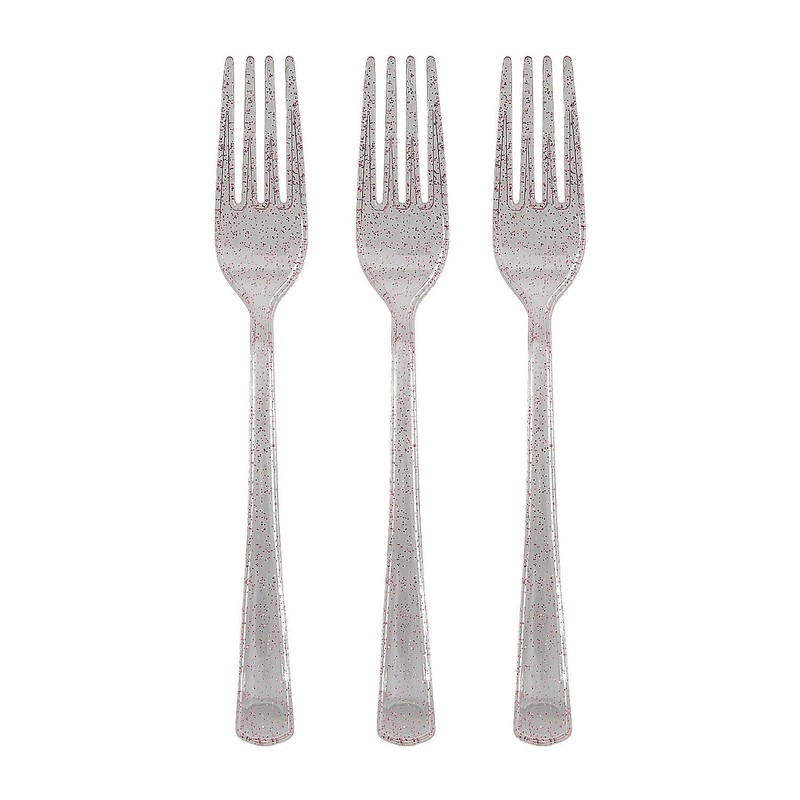 - A glam alternative to clear plastic cutlery, these plastic forks shimmer with pink glitter and are ideal for bachelorette parties and birthday parties. Material: Plastic. (4 dz./unit) Size: 7"