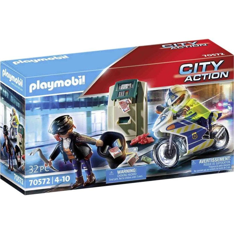 An ATM was broken into and money stolen, and now the police are on a Bank Robber Chase! The police motorcycle is in pursuit of the bank robber. Hurry, the robber has all the money stuffed in the bag! Set includes one police figure, bank robber, ATM, bank notes, and other accessories. Recommended for ages four to ten years.Warning. Choking Hazard. Small parts. Not for children under 3 years.