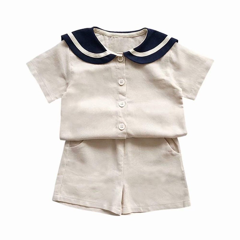 [POBIDOBY] ベビー服 子供服 セーラー服 Tシャツ+ハーフパンツ 2点セット リネン 半袖前開き かわいい トップス 半ズボン 男の子 女の子 キッズ 普段着 Beige 130