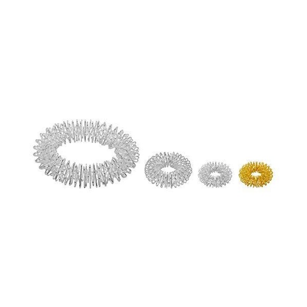 Package Content: 1 x ARM acupressure ring, 1 x Finger Massage Ring Silver Large, 1 x Finger Ring Silver Small, 1 x Finger Ring Gold Small