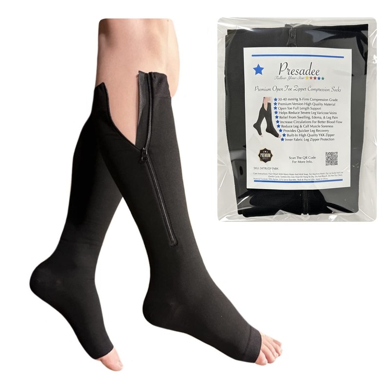 Presadee 30-40 mmHg Extra Firm Zipper Compression Leg Swelling Open Toe Socks (Black, 2)