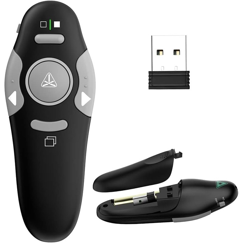 - Presentation Clicker with Red Light Pointer-Wireless presenter clicker boasts rf 2.4GHz,remote control distance range of up to 228 ft(70 meters),highly-sensitive signal without interference from others.The bright red laser pointer that's easy to highlight key areas of your slides,satisfies standards for office and classroom.