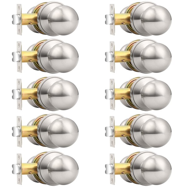 Probrico Round Brushed Nickel Passage Door Knobs Interior Door Handles for Hallway Closet, Keyless Passage Door Lock, 10Pack
