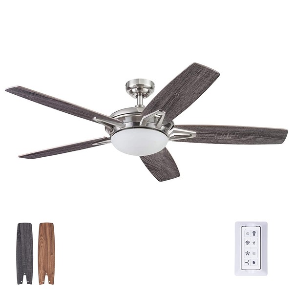 A contemporary fan with a sleek, streamlined look, the Prominence Home Clancy fits flawlessly in your modern spaces. This 52-inch ceiling fan features a beautifully rounded integrated dome light which provides a perfect contrast to the sharp angles of the modern peep-hole blade arms creating a striking focal point. The brush nickel finish of the Clancy boasts 5 reversible, easily adjustable blades with a warm caramel walnut on one side and a cool toned, dramatic coal finish on the other - the choice is yours!! The powerful motor and design provide adjustable, reversible air movement that is ultra-efficient whether you want to cool down on those sweltering summer days or circulate warm air in the cold months of winter. The included remote controls the power, 3 speed settings of the fan, the reversible airflow and light as well for the ultimate convenience. To ensure your long-term satisfaction, this fan is backed by a limited lifetime warranty. The Prominence Home Clancy gives you all the quality functions you deserve while providing the impressive eye- catching style you crave.