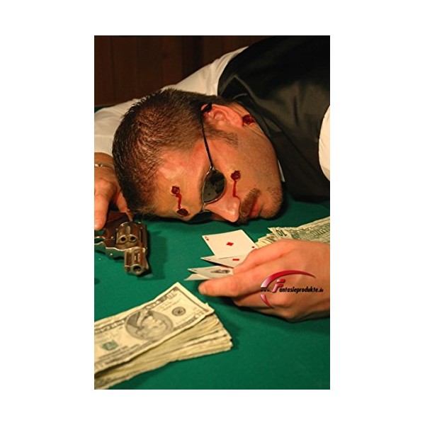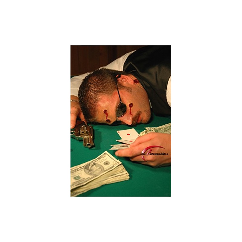 5 bullet wounds, for repeated use. Comes with detailed instructions (may not be in English), two blood colours and glue.