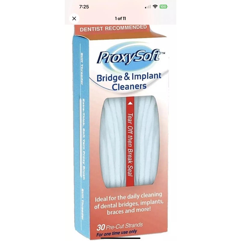 ProxySoft is a 3-in-1 Floss designed to be a daily floss with a regular size soft yarn proxy brush and threader. There is a smaller size proxy brush section. Periodontal Floss is designed to be a daily cleaning device with an extra thick soft yarn proxy brush and threader. The Bridge and Implant Cleaner is designed to be a daily cleaning device with an extra thick soft yarn proxy brush and threader.