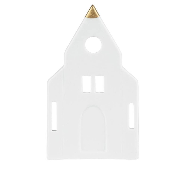 Small tea light holders made of porcelain, partly with gold glaze. Behind the church element is the holder for the tea light.