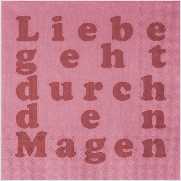 Lunch Napkins Add a special touch to your table setting with our charming napkin "Love goes through the stomach". This stylish napkin is not only a practical accessory, but also an expression of affection and hospitality. The loving design with the saying "Liebe geht durch den Stomen" brings a warm atmosphere to any meal and is perfect for romantic dinners, family celebrations or social evenings with friends. Whether at the festive occasion or in everyday life, this napkin is a wonderful detail that will enhance your table setting and spark conversation. Show your guests that you care about them and let love go through their stomach! Make every meal a special experience with the "Love goes through the stomach" napkin. Also ideal as a gift for anyone who loves cooking and enjoying! Size: 33 x 33 cm. One pack contains 20 pieces.