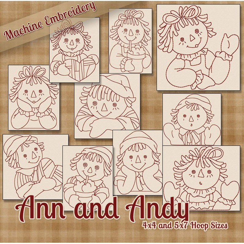 Raggedy Ann and Andy Redwork Embroidery Machine Designs on CD - Multiformat