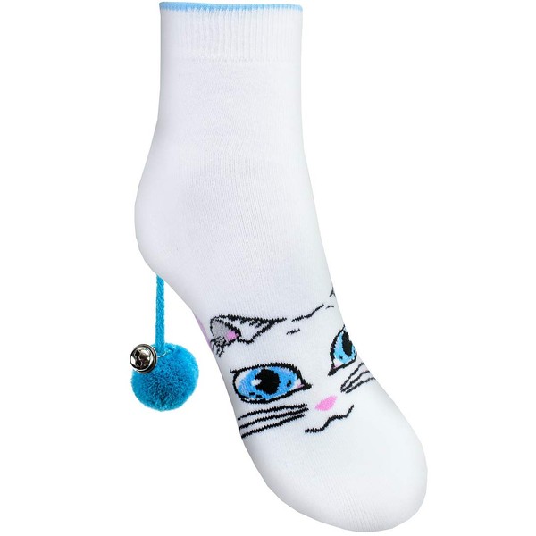 - Cat Socks Box are socks that look like a cat. Each sock has big eyes, a pink nose, long whiskers, a smiling mouth, and a tail, i.e. a pompom with a bell, attached with a strap. Cat socks are available in boxes of three, in three colours: black with a pink pompom, white with a blue pompom and grey with a light blue pompom, always with a non-slip layer. You can choose a pair. Available sizes: UK 3, 4, 5, 6, 7 (EU 36, 37, 38, 39, 40).