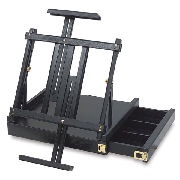 Form, function, beauty and an unbelievable price! The Ravenna easel possess all of these qualities and more. Unfolds for use on any steady surface and locks up snugly for travel. Made from seasoned hardwood and has an easily accessed side drawer plus a carrying handle. Holds canvas up to 34 inches tall. Black stained wood.