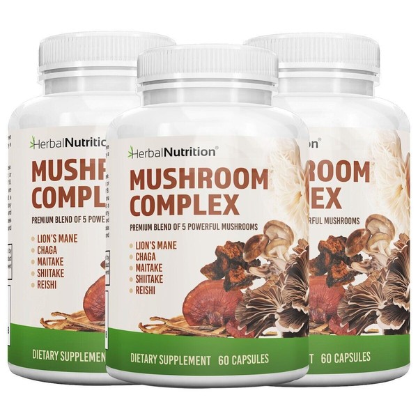 Three Pack - Herbal Nutrition Mushroom Complex 700mg to 1400mg. The 5 Most Powerful Mushrooms - Lions Mane, Reishi, Chaga, Maitake, Shiitake - Supports Immune Health, Nootropic Brain Health for Memory & Focus