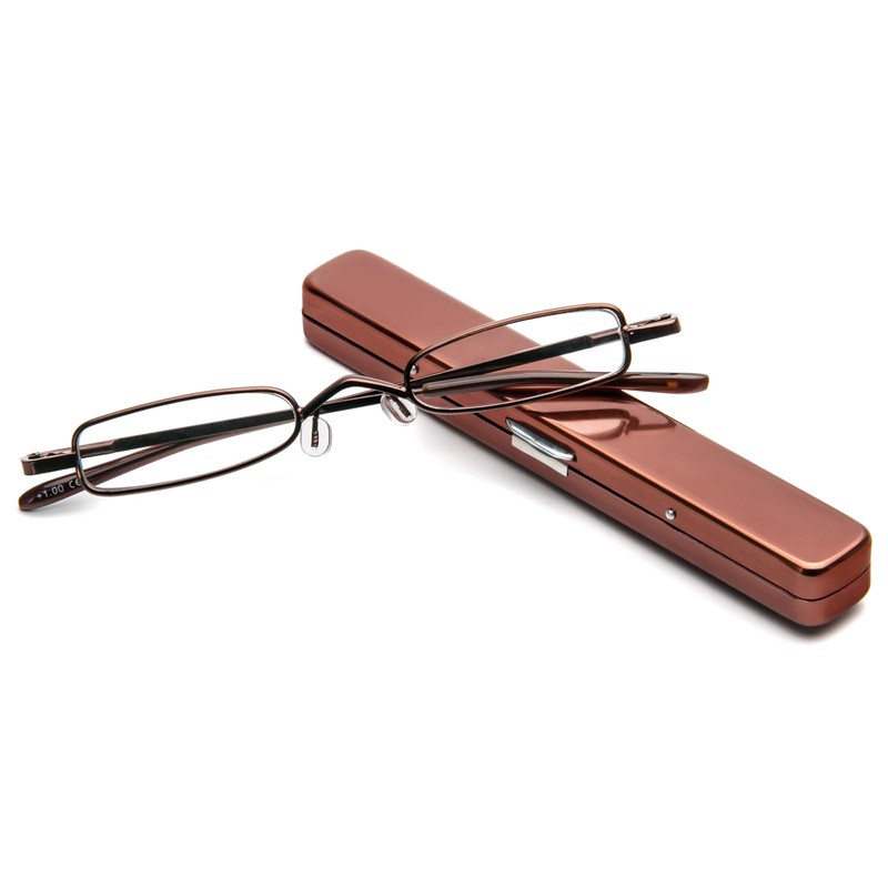 [REAVEE] 老眼鏡 ミニサイズフレーム メタル コンパクト ポケットに収納 軽量 男女兼用 おしゃれ ケース付き 度数 「+1.00」 ブラウン