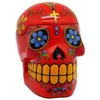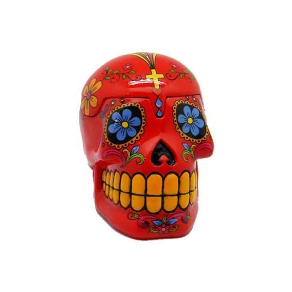 This beautiful, three dimensional Day Of The Dead sugar skull trinket box / ashtray is great for people who love skulls. The glossy white box features a wonderfully elaborate Mexican Day Of The Dead style flower pattern, and is coated with polyurethane to keep the design bright for years. Made of cold cast resin, the top comes off to reveal 3 recesses for cigarettes or cigars. It measures 4 1/2 inches tall, 3 1/2 inches wide and 4 1/2 inches long. The interior is 2 1/2 inches deep, 2 1/2 inches wide at its widest and 2 3/4 inches front to back.