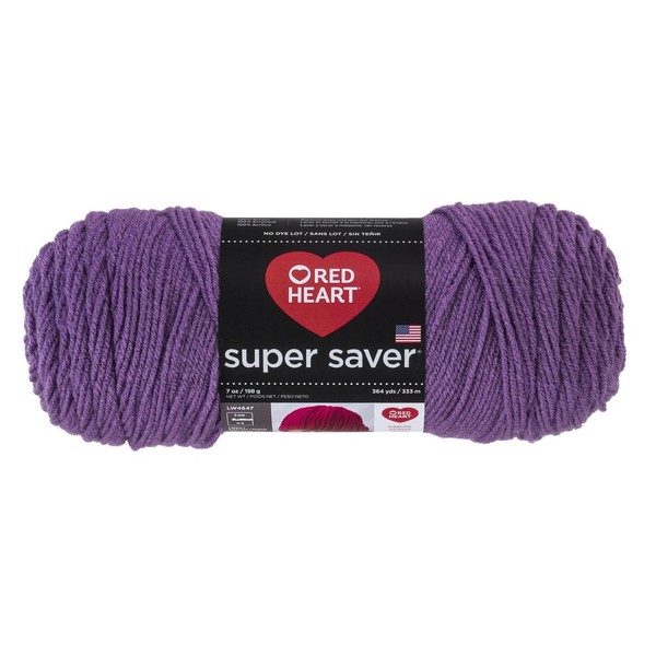 The great wash performance and no dye lot solids makes this red heart super saver solid yarn for wearable's, home accessories and more. Made of 96-percent acrylic and 4-percent other fibers worsted material. It is available for 5 mm knitting needle and 5.5 mm crochet hook. Care in structions are, machine wash (maximum temperature 104F/40C), tumble dry, do not bleach, do not iron and dry cleanable. Made in USA. Available in medium purple color. Measures 244-yards length.