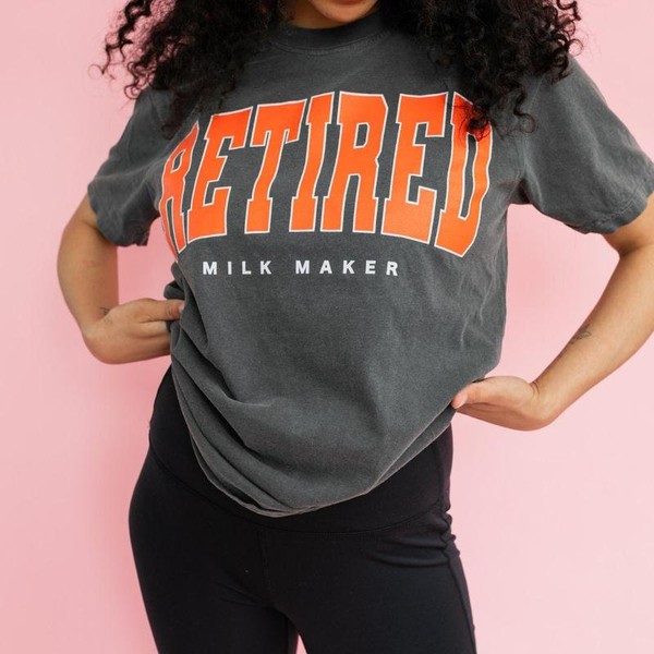 Our Retired Milk Maker design printed in orange on a vintage wash charcoal tee.