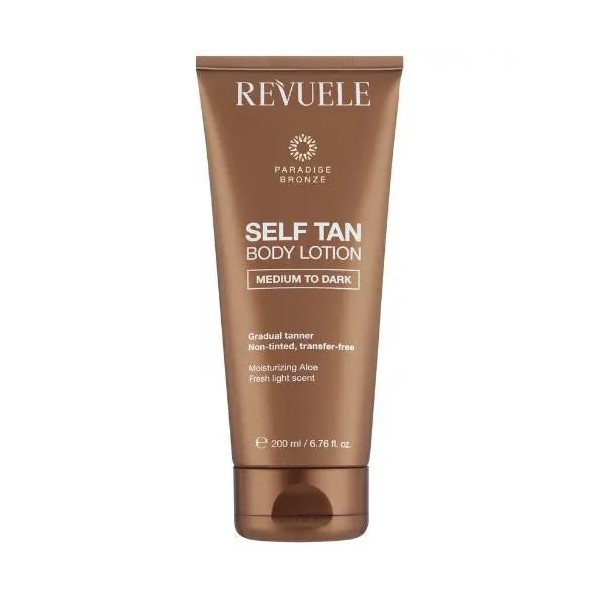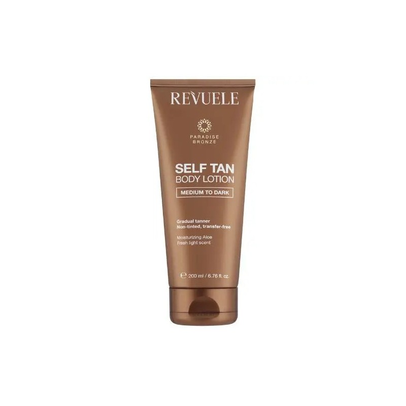 The Revuele Self Tan Body Lotion Medium to Dark is a moisturizing body lotion that gives your skin a sun-kissed touch after a few hours! Thanks to its light texture, the lotion is quickly absorbed and does not leave stains on your clothes or bedding. The more often you apply the body lotion, the darker the color will become, which is handy!