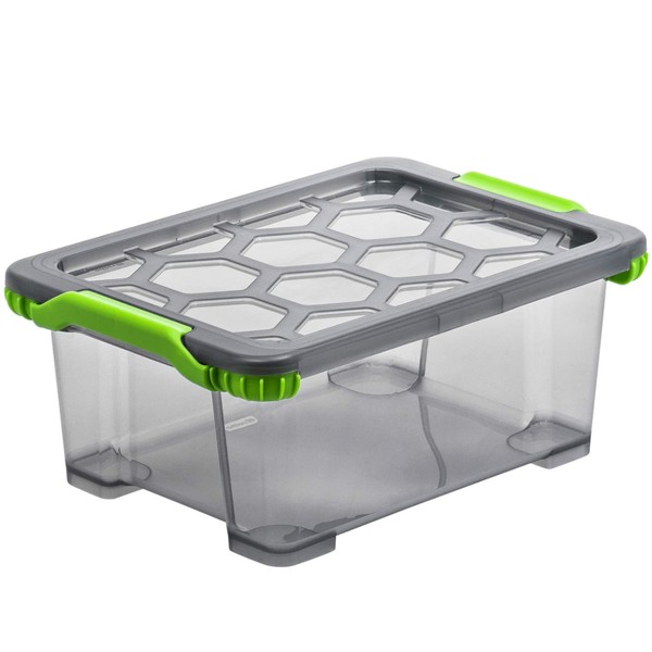 - Dimensions: 39.3 x 28.3 x 16 cm (L x W x H), inner dimensions: 26.1 x 20.5 x 14.7 cm (L x W x H) – grey clip box with volume: 11 litres – stacking box colour: anthracite translucent, green handles