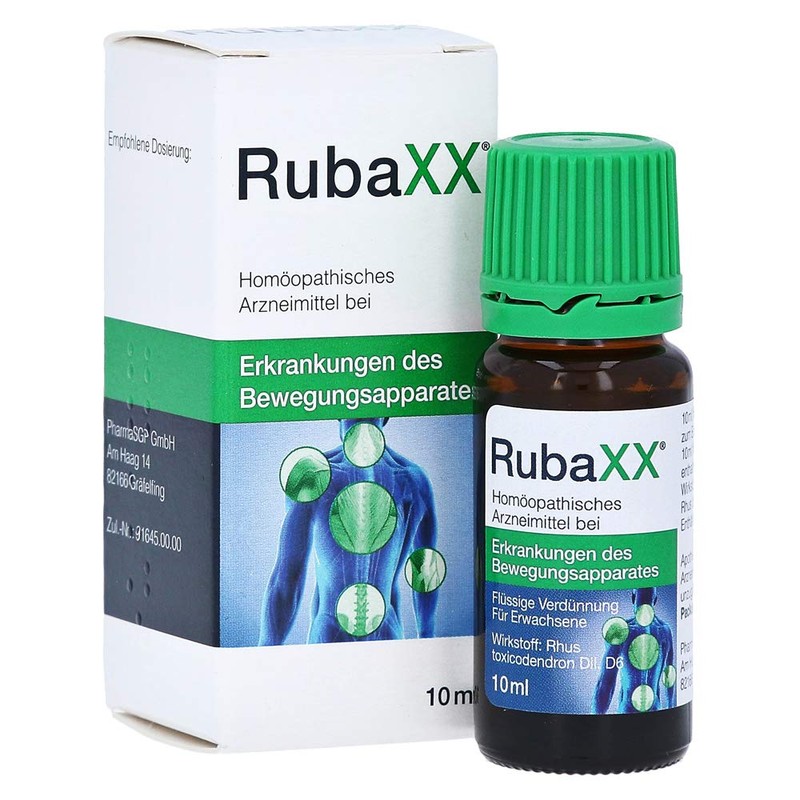 RUBAXX. Active ingredient: Rhus toxicodendron dil. D6 Areas of application: Hom opathic medicine for rheumatic pain in bones, bone membrane, joints, tendons and muscles and consequences of injuries and strain. WARNING: ENTH LT 51% VOL.-ALCOHOL.