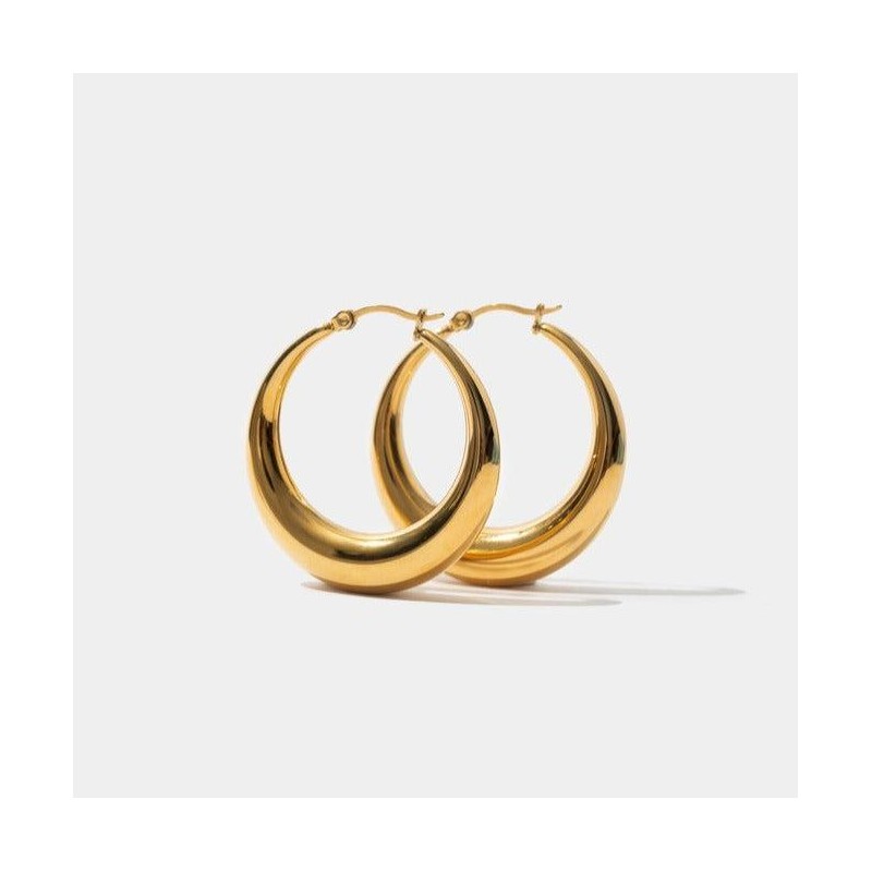 Inspired by the simplicity of a classic hoop, our Rumi gold hoops offer a subtle twist to an iconic style. These earrings start off slim then gradually increases in volume toward the base, forming a bold design. Don't even think twice about it, your gold collection needs this. Rumi is made of premium stainless steel and coated with 18k gold. To finish off your look, pair these stylish hoops with our Jada dome ring.