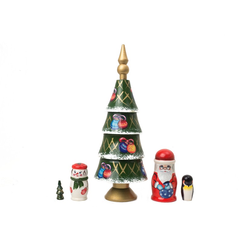 - This unique Christmas Tree Nesting Doll has Santa, a snowman with red mittens, a penguin, and a glittering little Christmas tree hiding inside.