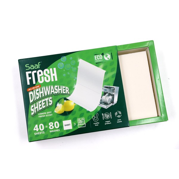 Dishwasher Sheets Saaf Fresh All-in-One Dishwasher Sheets revolutionize the way you clean your dishes. These innovative sheets provide a Lemon Zest Fresh Scent and offer a convenient, eco-friendly alternative to traditional dishwasher detergents. Each package contains 40-80 sheets, capable of handling a comparable number of washes. The sheets are cruelty-free, a vegan product, and promote zero waste, making them an excellent choice for environmentally conscious consumers.