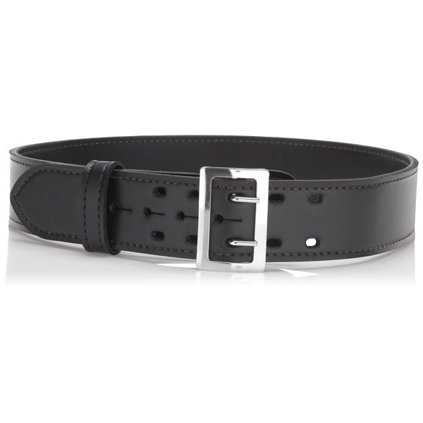 - Double-tongued buckle and center belt stud fasten belt firmly around waist