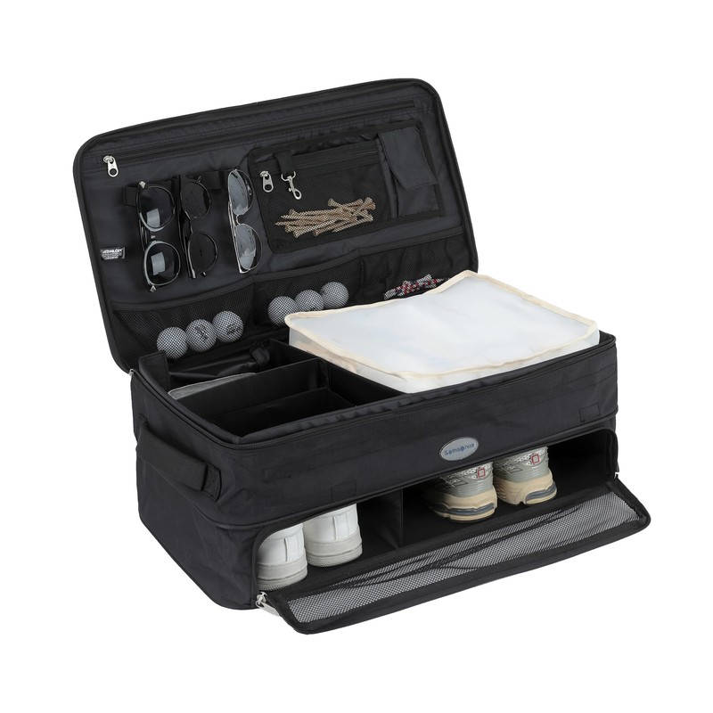 Organize your golf gear and accessories inside this convenient golf trunk organizer from Samsonite. The Samsonite Golf Travel Golf Trunk Organizer is made from rip-stop poly fabric with waterproof backing and has a roomy fold down design with two levels that expand to offer you plenty of packing space. The bottom level has divided compartments and can hold up to three pair of golf shoes while the top level has movable dividers to accommodate clothing, socks, or extra layers. Other features of this case include an organizer panel in the lid to hold your tees, gloves, or other accessories, a pouch to hold your cell phone or sunglasses, and two ergonomic carry handles.