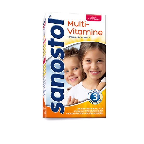 sanostol No added sugar, juice PZN: 2171823. Contents: 460 ml. Delicious, balanced vitamin supply for children from 3 years. Dietary supplement with vitamins with sweetener. Warnings: The product contains vitamin A. Pregnant women and women who cannot rule out pregnancy should consult their doctor before starting consumption. The recommended daily dose should not be exceeded. Dietary supplements should not be used as a replacement for a balanced and varied diet as well as a healthy lifestyle. Can have a laxative effect if consumed excessively. Suggested use: children over 3 years old receive 10 ml (1 scoop) daily, the same dosage applies to teenagers and adults. Do not exceed the recommended daily dose. Information about the manufacturer: Dr. KADE Pharmazeutische Fabrik GmbH Rigistraße 2 12277 Berlin