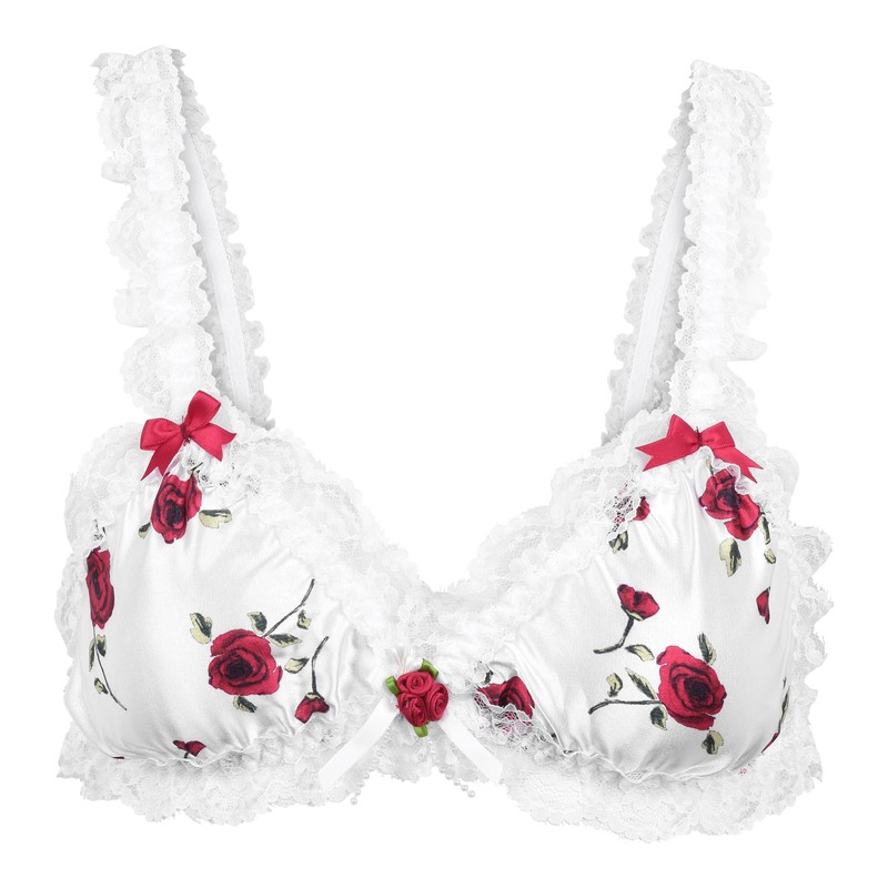 Satini Sissy Ruffle Lace Fitted Satin Bralette Bra, White - Red Roses