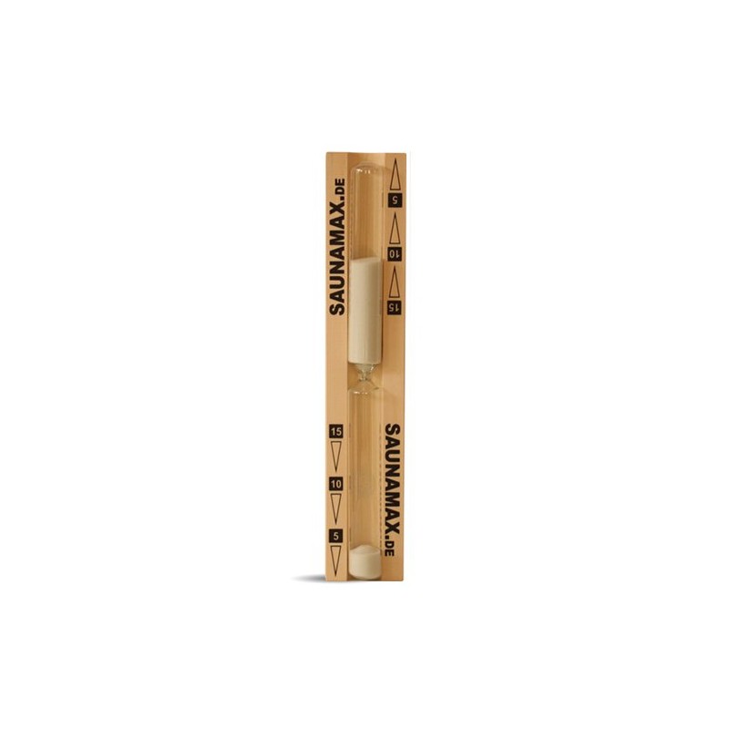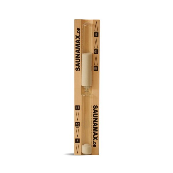 The sauna sand glass features a scale in 5 minutes sections of and 15-minute flow time.