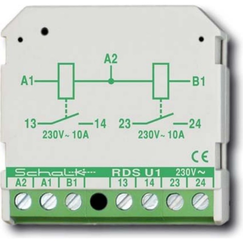 Kompaktes Schaltrelais für Doseneinbau mit geringer Verlustleistung und zwei getrennten Magnetsystemen. ### Merkmale * Funktion: mechanisch * Montageart: Unterputz * Einbautiefe: 18,5 mm * Anzahl der Schließer: 2 * Anzahl der Öffner: 0 * Anzahl der Wechsler: 0 * Steuerspannung 1: 230..230 V * Steuerspannungsart 1: AC * Frequenz der Steuerspannung 1: 50..50 Hz * Bemessungsstrom: 10 A * Versorgungsspannung: 230..230 V * Spannungsart der Versorgungsspannung: AC * Max. Glühlampenlast: 600 W