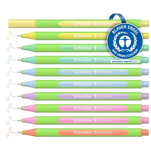 - Box contents: 10 pieces Schneider line up pastel fineliner pens in cardboard box, assorted colours (vanilla, mint, blue (2x), purple, pink (2x), apricot, turquoise, lime)