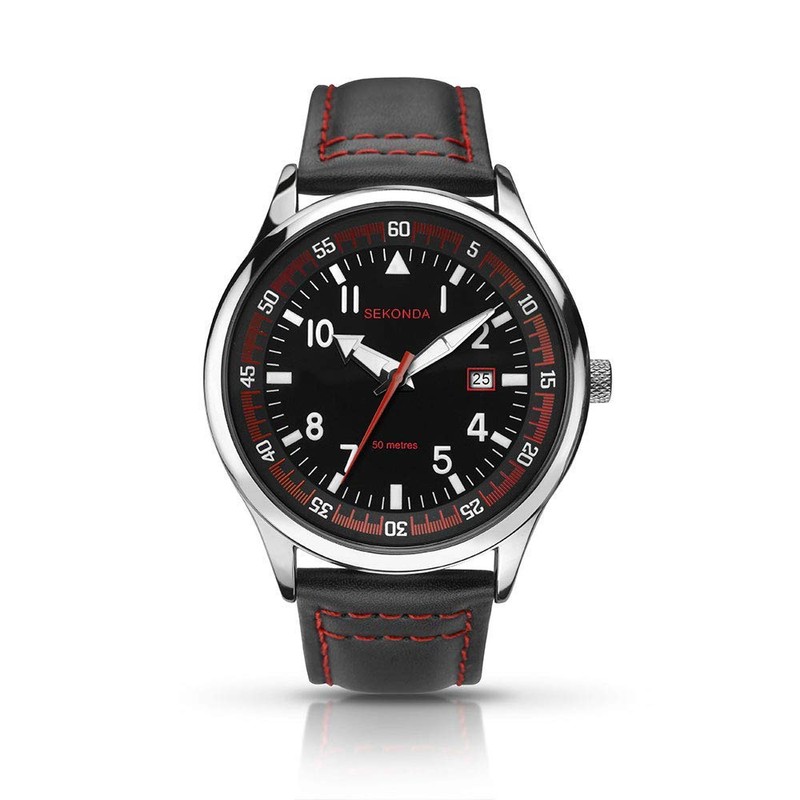 Sekonda Mens Black Leather Strap with Red Stitching Analogue Watch 1463